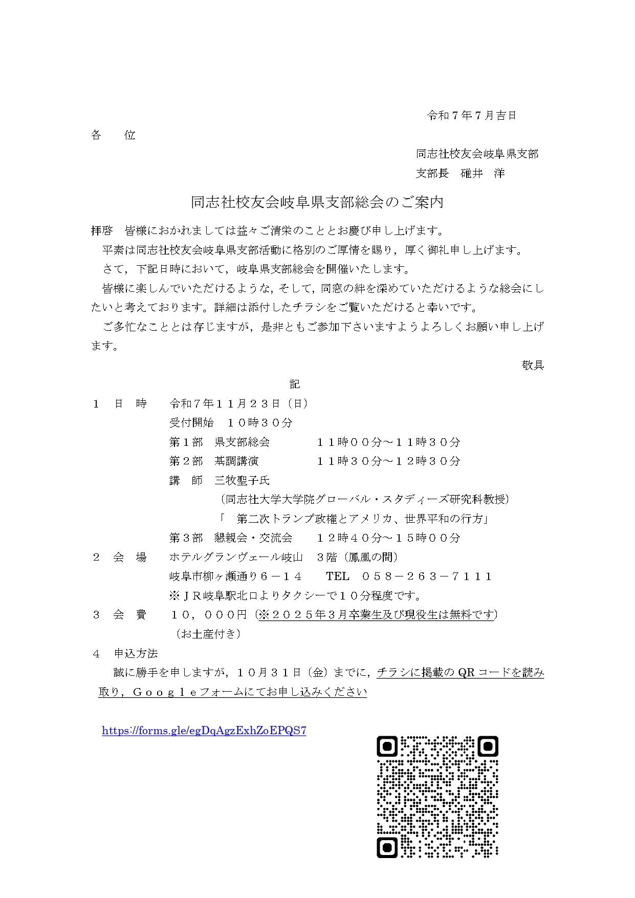 平素は同志社校友会岐阜県支部活動に格別のご厚情を賜り,厚く御礼申し上げます。